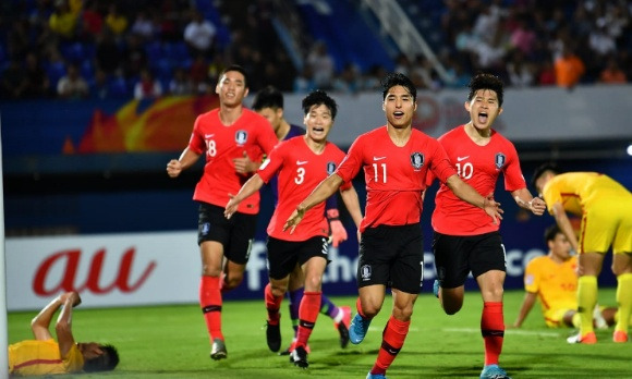 한국 이동준이 골을 넣은 뒤 기뻐하고 있다.
